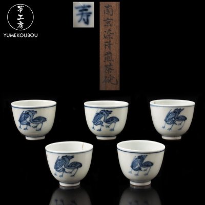 【夢工房】南京 染付 鳥図 煎茶碗 五客 箱入 AG-024
