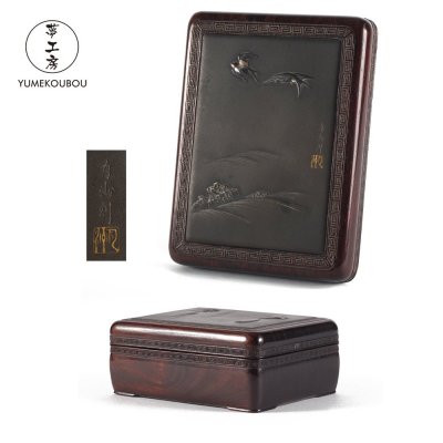 【夢工房】有洲刻 四分一象嵌 波飛鳥図 金工 唐木 莨箱 在銘 PE-016