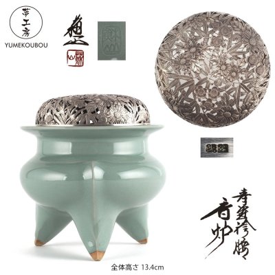 【夢工房】三代 諏訪 蘇山 造 青磁 袴腰 大振 香炉 純銀 四君子透 火舎 共箱 二重箱 火舎重量123g 銀純度99.82% AG-016