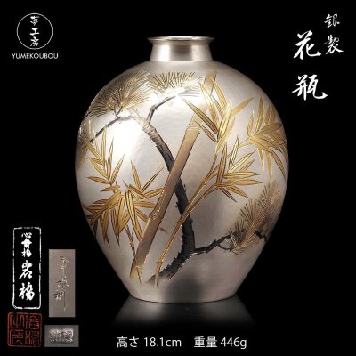 【夢工房】純銀 幸景 刻 松竹図彫 金工 花瓶 共箱 高さ18.1㎝ 銀純度99.99% AG-028