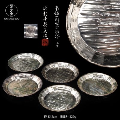 【夢工房】竹影堂 栄真 造 純銀 一閑写 折溜盆 五客 共箱 重量計522g 銀純度99.99% AG-026