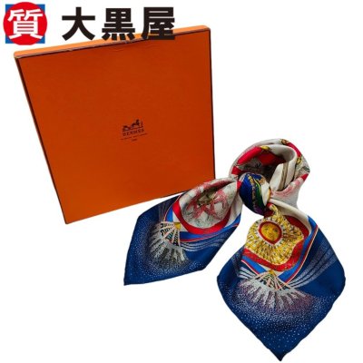 【大黒屋82】HERMES エルメス スカーフ カレ90 FEUX DARTIFICE シルク ネイビー 馬 服飾小物 バッグスカーフ ヘアアクセサリー 大判 ベルト