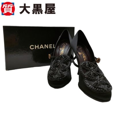 【大黒屋82】CHANEL シャネル パンプス 38 ブラック 別箱付き ピンヒール ラウンドトゥ ストラップ付き ハイヒール ビーズ ビジュー