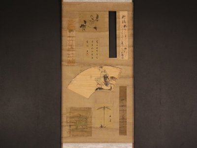 【模写】【伝来】am4790〈喜多川歌麿 大田蜀山人 谷文晁 谷文一 抱一 有長 五山〉8枚貼交 扇面 美人図 浮世絵 書 和歌 花・桃・蜻蛉図