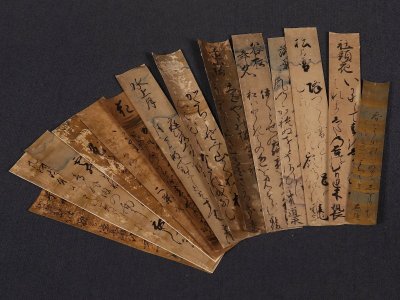 【模写】【伝来】am4829〈仁和寺宮道永法親王 甘露寺親長 庭田雅純 慈延 高倉永俊 他〉和歌 短冊 14枚組 室町-江戸時代 マクリ 蓮空 公卿