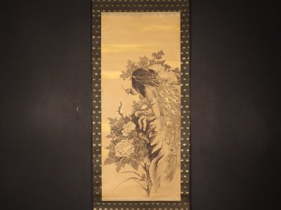 【伝来】kj1065 牡丹に孔雀図 墨に金泥絵 無落款