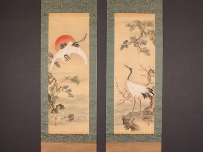 【模写】【伝来】am7866〈狩野永秀〉双幅 松竹梅に鶴図 知信 江戸時代後期