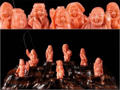 【流】天然珊瑚 珊瑚彫刻七福神置物 重量2060g HD317