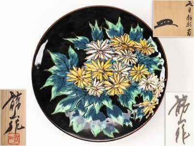 【流】青木龍山 天目釉彩菊皿 幅24cm UD395