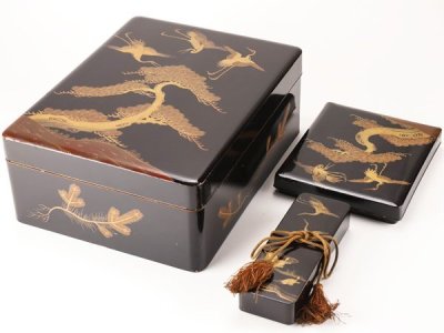 【流】時代漆器 鶴亀波蒔絵文庫箱 硯箱 箱付 HD253