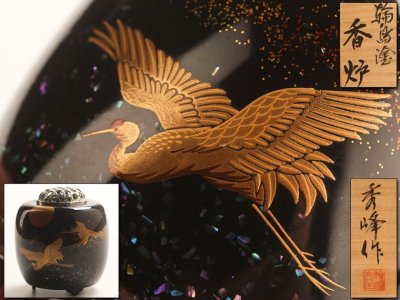 【流】能登輪島塗 秀峰作 鶴蒔絵螺鈿細工香炉 共箱 HD355