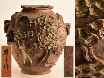 【流】鍋島焼 幾平作 彩釉山水彫大花瓶 共箱 高59cm TZ104