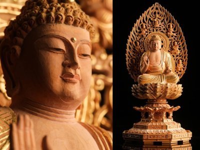 【流】仏教美術 木彫金彩 薬師如来座像 高31.5cm UE099